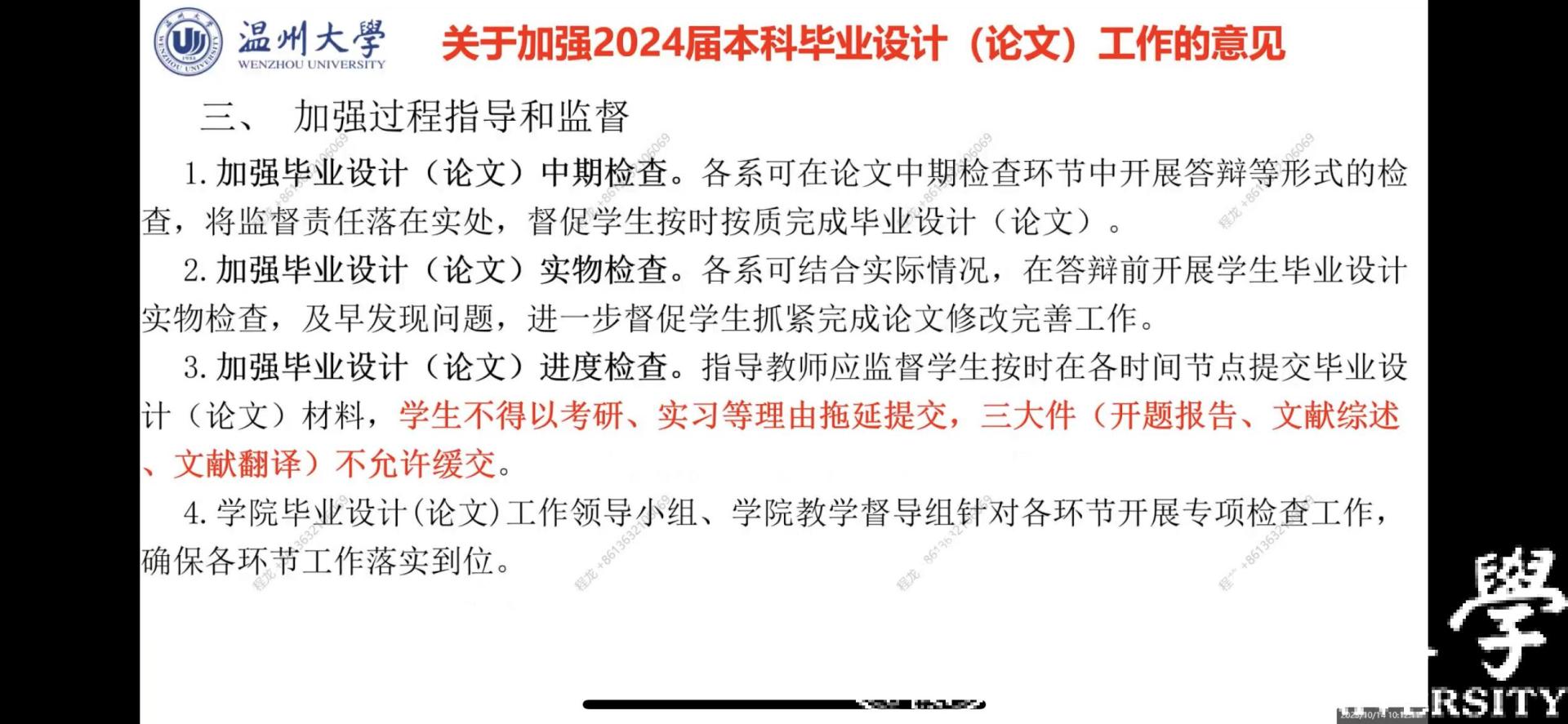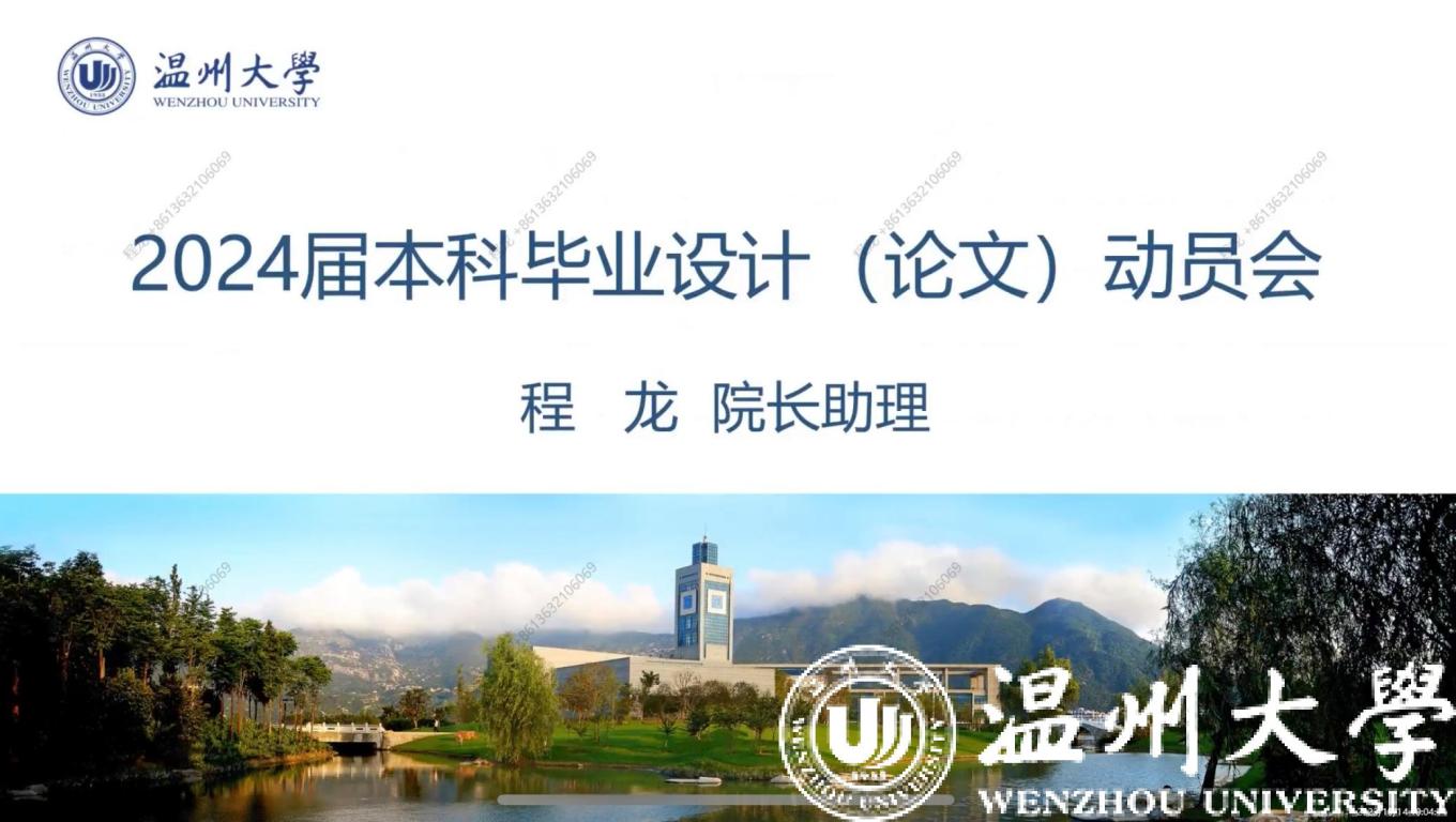 接着,院长助理程龙老师介绍了2024届本科毕业设计(论文)日程安排和基本要求,强调毕业设计的重要性与各个材料提交的时间节点;传达了学院《关于加强2024届本科毕业设计(论文)工作的意见》,提出要加强毕设过程指导和监督、开展专项检查工作、落实警告制度、严把答辩审查关,以此提醒各位同学不可懈怠,要重视各项毕业相关工作的要求和时限,提早规划,按时按质完成毕业设计。同时,要求各位指导老师要充分发挥学生的主动性和积极性,注重培养学生的创新能力和实践能力,及时对学生进行过程指导、检查和答疑,做好指导记录,确保学生毕业设计的进度和质量。