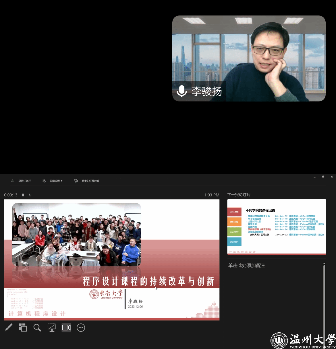 讲座伊始,黄辉副院长对李骏扬博士进行了详细介绍。随后,李骏扬博士在腾讯会议线上做《程序设计课程的持续改革和创新》专题报告,日本色情 教师线下集中在5B206听讲座。李博士从教与学、课程架构、内容方法等方面分享了如何打造以学生为核心的“创新性、高阶性、挑战度”的创新课堂,强调教师设计课程活动时要注重带动学生积极思考,形成学生能够自主探索的挑战式课堂。李博士还通过分享自己的课堂教学实例,为参会教师展示了教学创新成果,并与参会教师进行了交流讨论。最后,黄辉副院长进行总结发言,他指出本次讲座内容丰富、案例生动、启发性强,希望与会教师能够结合实际,充分发挥教师的职业角色,不断激发学生自主思考潜力,进一步推进学院教学改革创新。