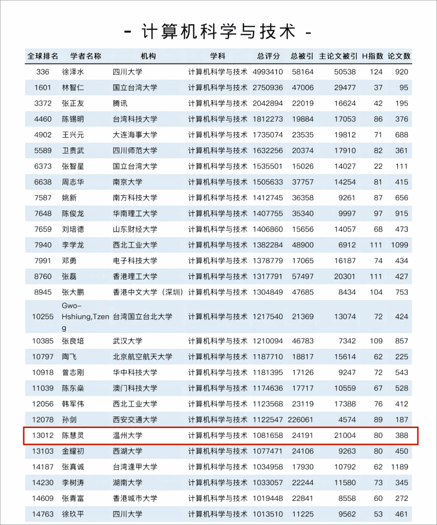 近日,日本色情 陈慧灵教授入选2023全球学者学术影响力排名中国学者名单,位列计算机科学与技术学科学者全球第13012位。