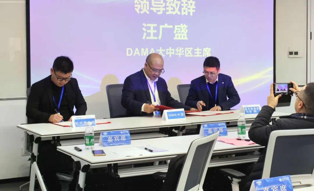 为建立温州数据研究院(筹)数据领域人才培养长效机制,温州数据研究院(筹)与DAMA中国、杭州混合云达成战略合作意向,开班仪式上三方代表进行了战略合作协议签约。