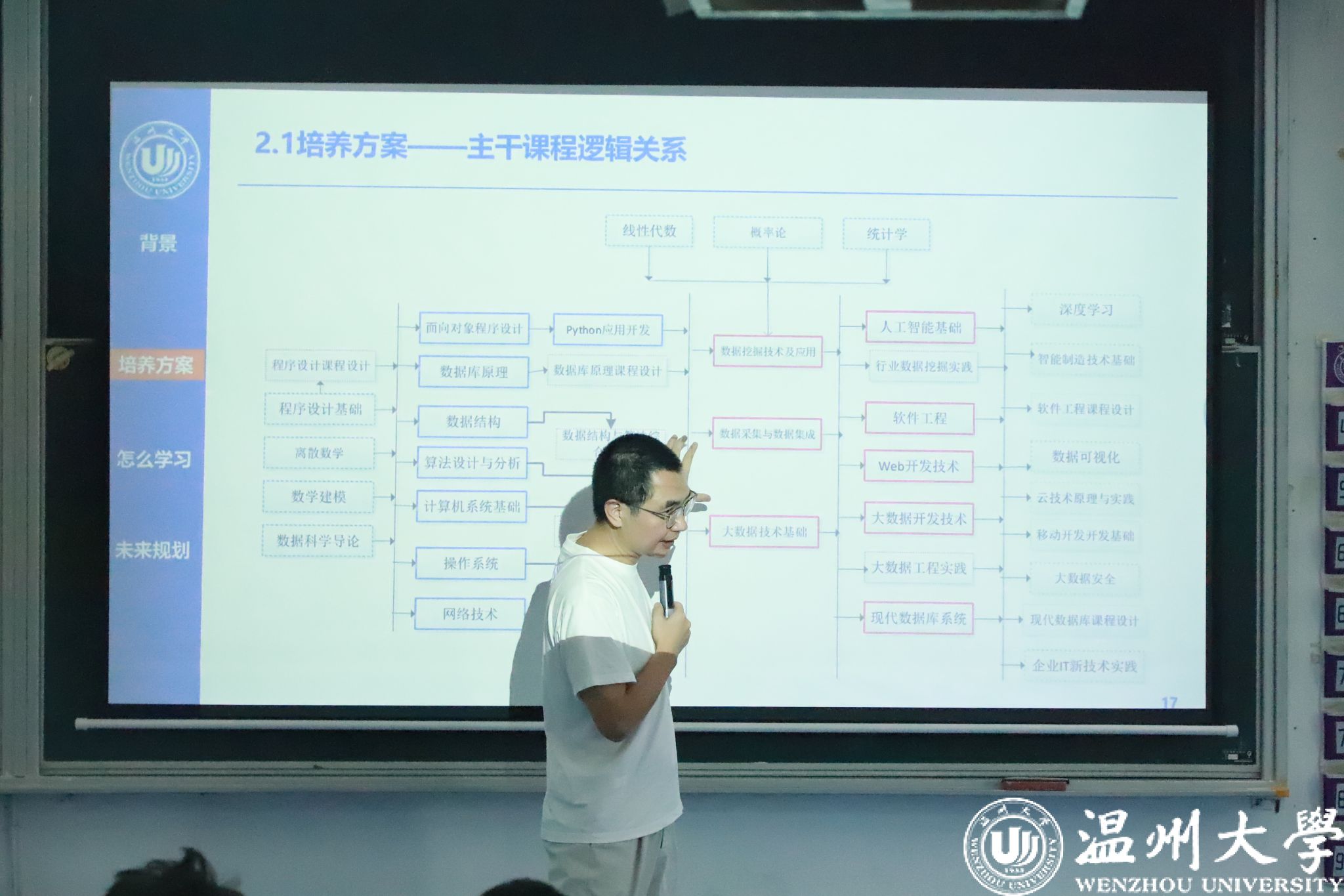 李洪老师为2024级新生们进行数据科学与大数据技术专业介绍。他从生产力与生产要素发展变革的历程出发,指出“数据”是第五生产要素,希望大家要从时代变革和国家安全的角度树立正确的数据安全观念。同时,他为2024级新生详细介绍培养方案内专业课程内容、课程建设逻辑架构和各类课程的学习方法,他指出,数据科学是以计算机科学技术为主导,融合数学和统计以及领域的业务知识的一门学科,学校依托大数据研究院、浙江省重点实验室等平台,开展深度融合的“产学研用”一体化人才培养模式,为2024级新生未来的考研或就业之路提供扎实的基础,并希望同学们能够利用好学习资源,实现自身学习目标。