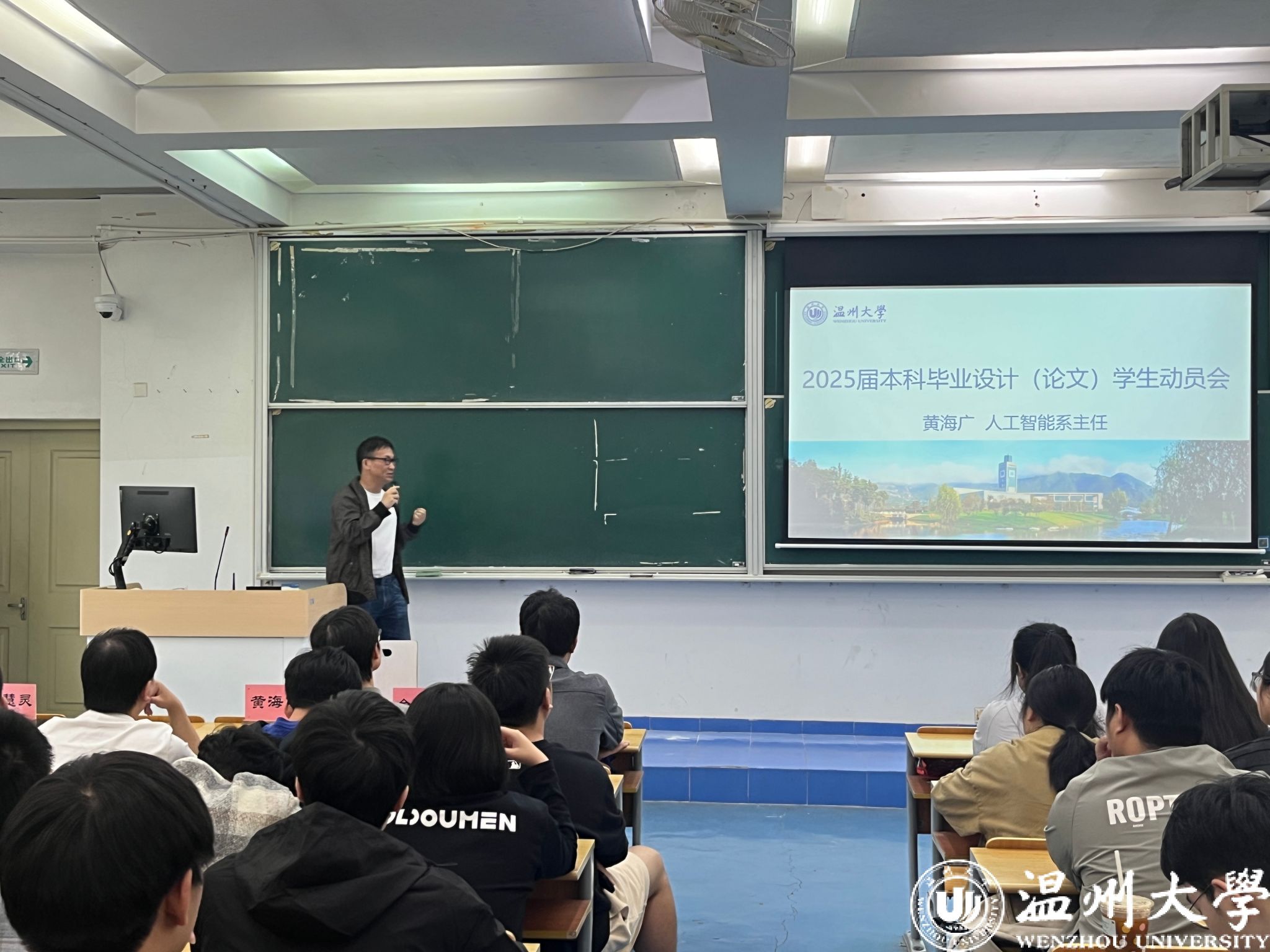 接着,人工智能系主任黄海广老师重点讲解了如何做好毕业设计的方法,以及内容的撰写需符合学术规范。他就最近的诺贝尔颁奖新闻结合人工智能领域专业知识发表了自己的见解,鼓励学生在做毕业设计时可以跨学科融合,注重算法与模型的优化与创新,结合前沿趋势选择具有实用价值的课题。