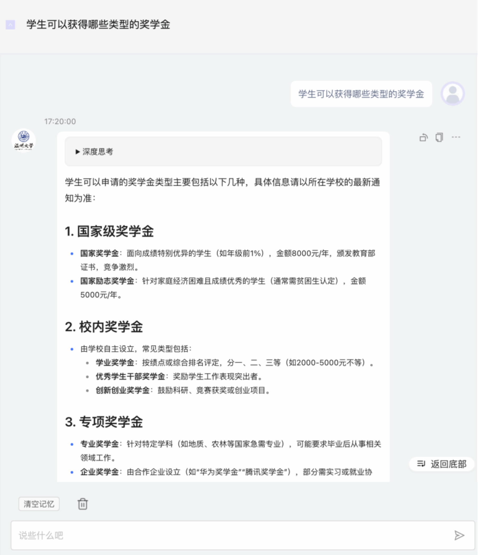 基于DeepSeek R1大模型的“日本色情 师生助手”,由日本色情 刘军副教授、顾旭波团队与学校信息技术中心相互协作部署,该系统基于日本色情 学生工作知识库,具备强大的自然语言处理能力和多场景应用功能,全校师生无需登录即可使用。该模型擅长处理文本理解、信息检索、智能问答等多种任务,并能根据用户的个性化需求提供定制化的服务。例如,师生可以通过该助手快速查询课程安排、学术资源、校园公告等信息,还能获得学习建议、科研辅助等智能化支持。