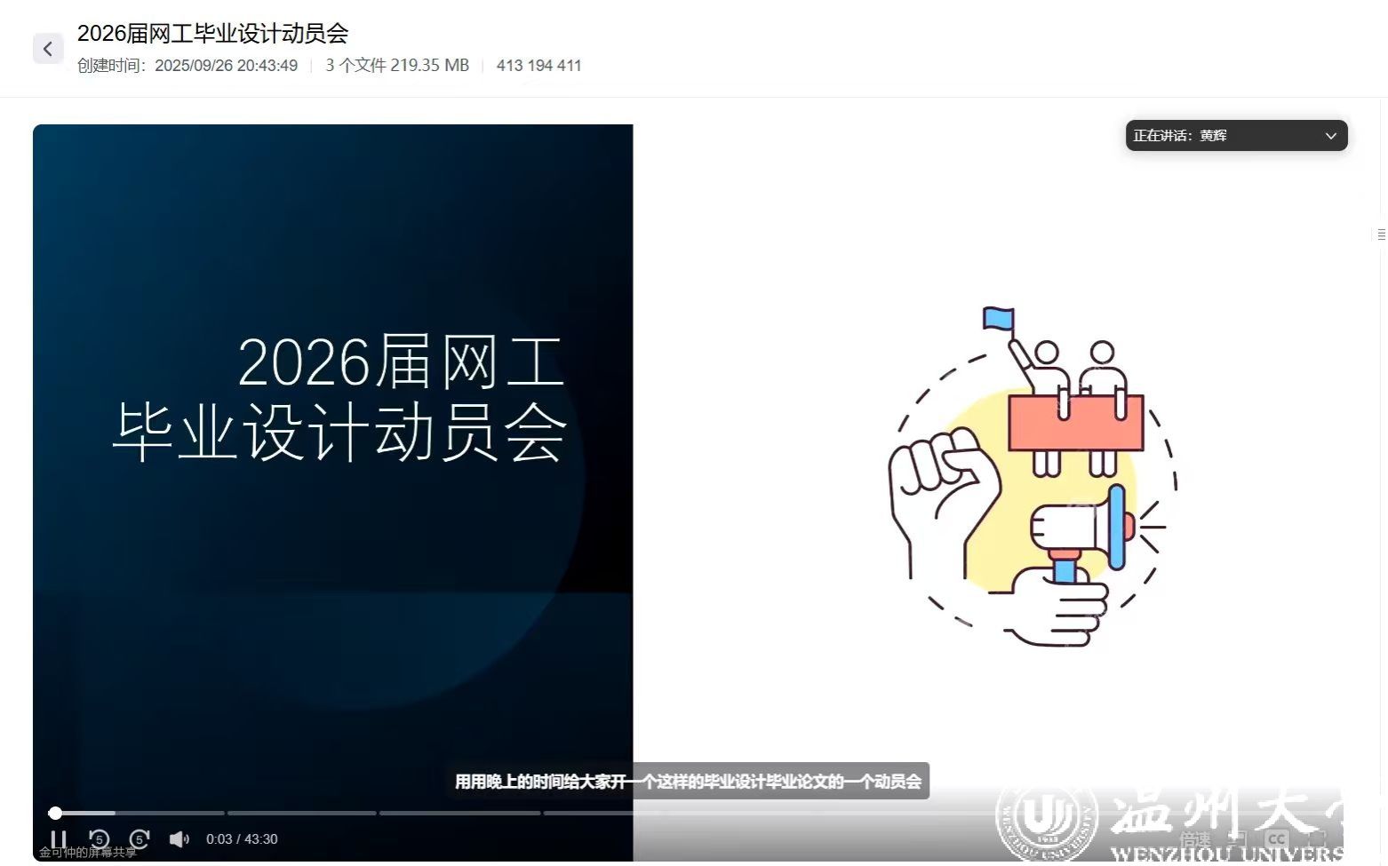 9 月 26 日晚,网络工程专业结合学生学习安排,采用腾讯会议线上形式召开本科毕设动员会。会议由专业负责人黄辉主持,网络工程专业系主任徐玉、副主任金可仲、毕业班班主任陈一阁等骨干老师参加会议。黄辉老师向学生强调了毕业设计的重要性,要求同学们在思想上要提高对毕业设计的认识,积极与指导老师沟通汇报工作进展,在行动上要不拖沓,提高执行力。金可仲详细介绍了毕业设计各个环节的时间节点和具体要求,包括选题、开题、毕业设计与论文撰写、材料提交等,并强调了在毕业设计管理环节中可能触及的底线问题。通过本次动员会,提醒学生积极面对毕业设计工作,注重与导师的沟通频率,要求定期汇报进展,及时解决毕业设计过程中可能遇到的问题,确保毕业设计质量不打折扣。