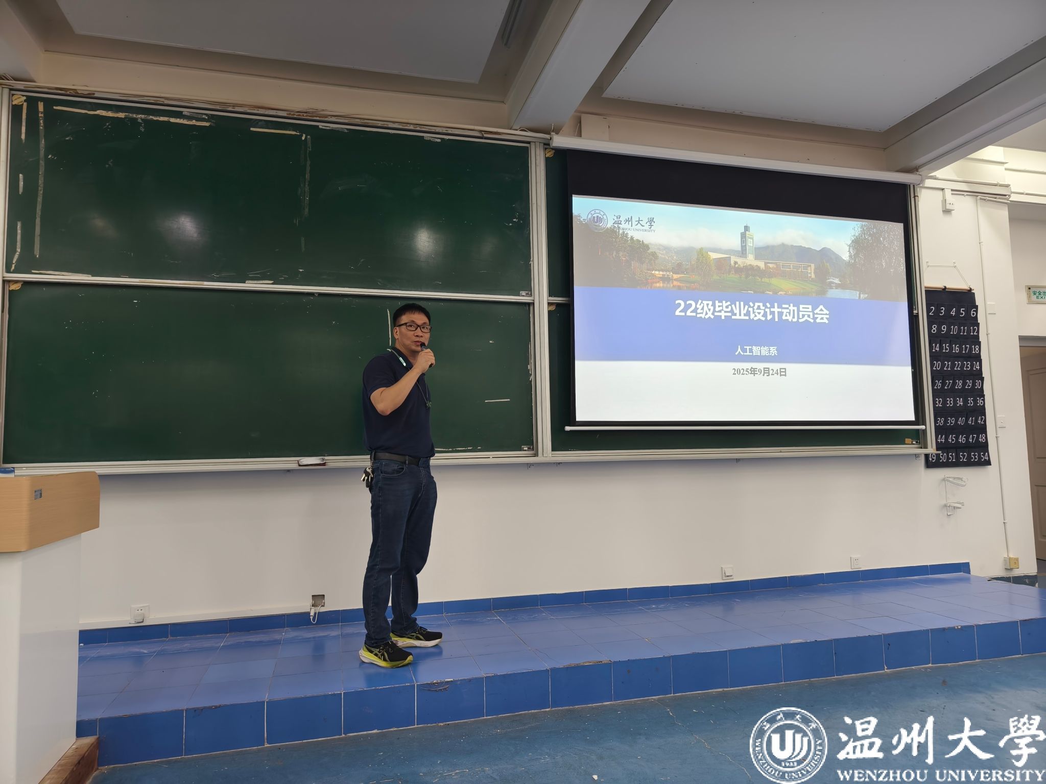 9 月 24 日下午,人工智能专业在 5A101 教室召开本科毕设动员会,专业负责人张楠、系主任黄海广、系副主任徐震以及全体系部老师参加会议。会上,系主任黄海广老师通过筛选典型毕设案例,从选题创新性、技术可行性、研究价值等方面进行深度剖析,帮助学生理解如何结合自身专业优势确定研究方向;同时针对人工智能类论文中算法描述、实验验证等特殊要求展开专项指导,明确论文格式细节与查重注意事项,为学生搭建清晰的毕设写作框架。