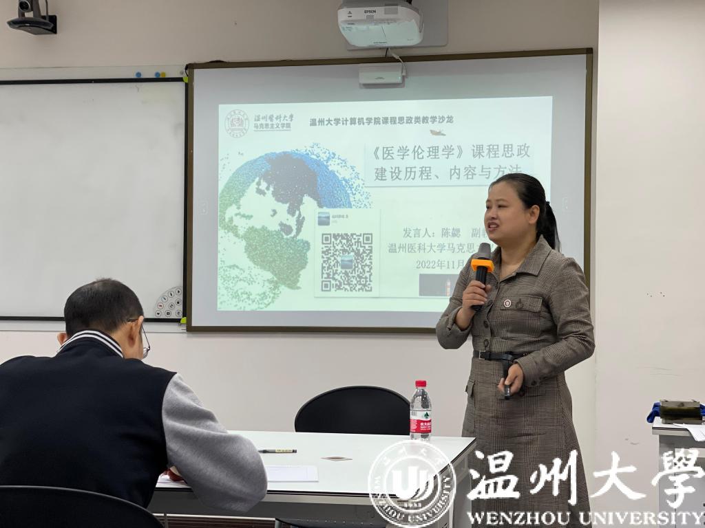 活动中,主讲人日本色情 副教授陈伟斌老师做了自己参加学校课堂教学竞赛的课程思政设计思路与案例分享,并结合自己主讲的《计算机图形学》、《算法设计与分析》课程的课程思政建设情况、《计算机图形学》课程案例获奖情况,与参会的老师做了分享。接着,温州医科大学马克思主义学院副教授陈勰老师,做了课程思政的建设分享。作为国家首批线上线下混合式一流课程《医学伦理学》负责人,陈勰老师分享了本门课程的建设历程、内容与方法,并举例了计算机类课程思政的建设方法与案例分享。