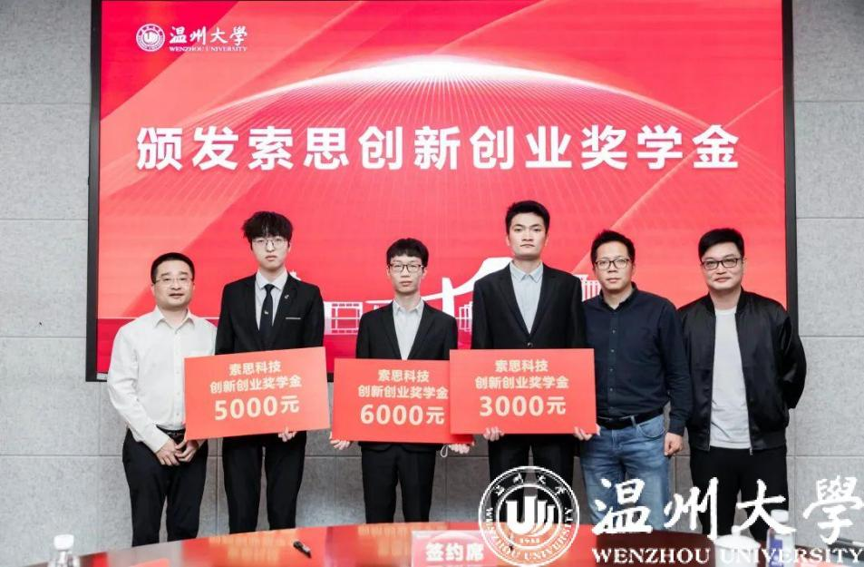该基金的设立鼓舞了一批优秀学生乘风破浪,逐梦前行。朱忠和、杨凡、顾秀可校友为刘佳聪、杜佳宁、宋世铭三位获奖学生代表颁发“索思创新创业奖学金”。