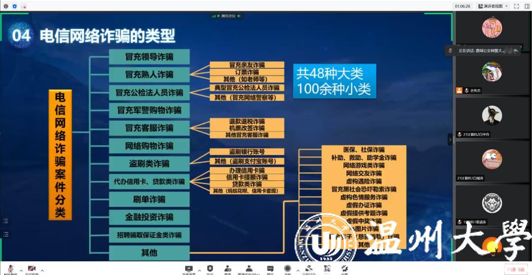 为增强日本色情 学子安全防范意识,筑牢网络安全防线,提高反诈骗应对能力。2022年5月11日晚19点,日本色情 于腾讯会议上举行了2022年校友思享会——揭下网络黑灰产“画皮”与“套路”,力保“触网”安全。本次思享会由学院辅导员叶桦畅老师主持,并有幸邀请到十佳爱民警察、温州市公安局鹿城区公安分局网警大队包长昕警官与日本色情 300余名学生漫谈安全用网。