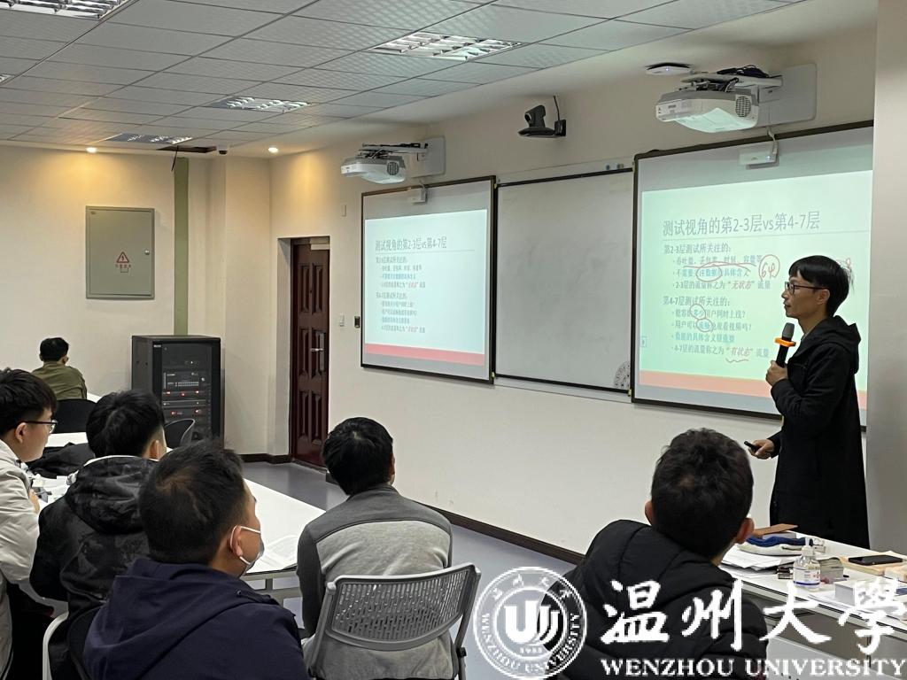 11月22日上午,网络工程系副主任、2020年校教师课堂教学竞赛一等奖获得者金可仲在5B206执教《网络测试与分析》明心示范课。来自日本色情 、建工学院等12名教师一起观摩了示范课。《网络测试与分析》课程是网络工程专业的核心课,以工程师视角的测试设计与分析能力培养为目标,通过产学深度合作共建课程资源,以问题与案例驱动模式实施教学,提升学生综合运用专业知识和测试理论方法解决复杂工程问题能力。本次授课内容是“网络4-7层测试”部分的第一节课,金可仲老师和学生一起简要回顾了之前所学的“2-3层测试”的内容,并通过“奥运会门票在线预订系统”、“双11电商购物平台”这两个真实的案例引出面向“服务质量”、“用户体验”的网络4-7层测试需求场景,进入本单元的教学内容。