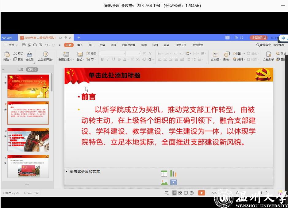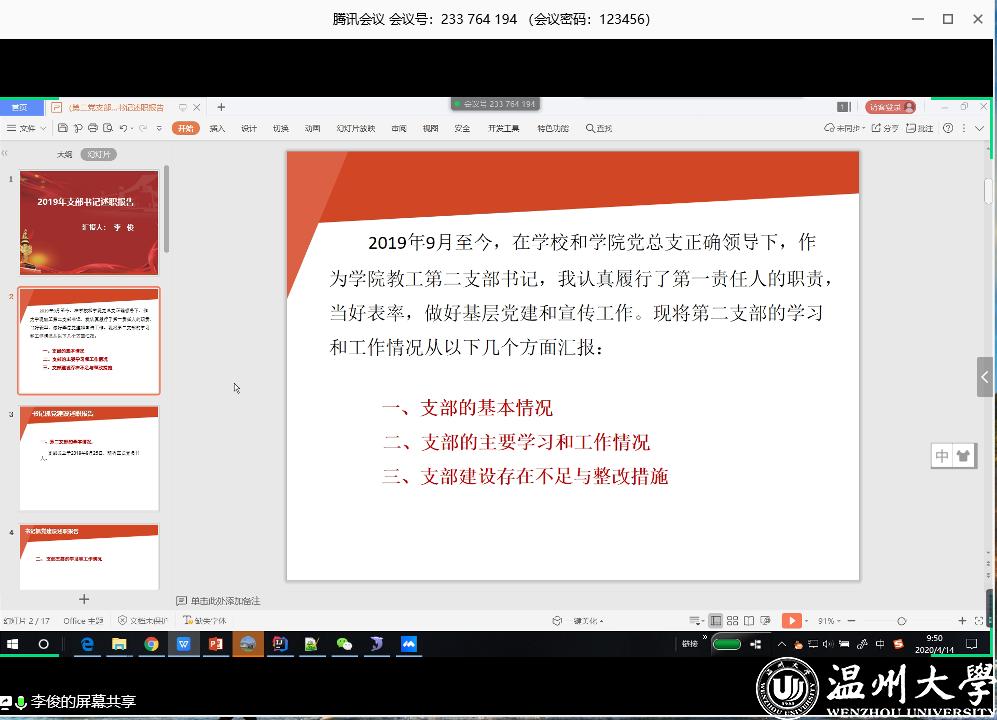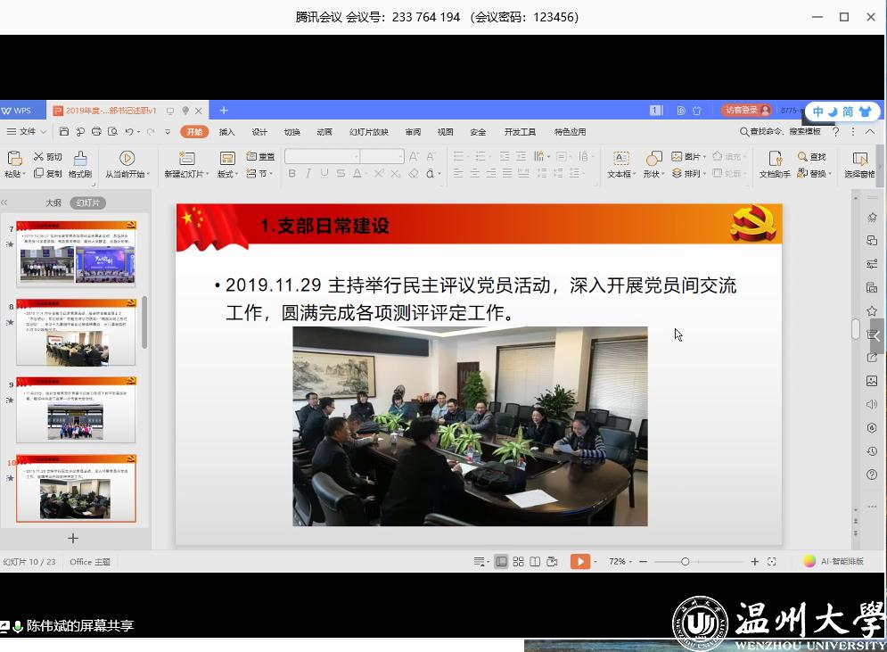 2020年4月14日上午9点,日本色情 在腾讯会议上顺利召开2019年度党支部书记工作述职会。学院党委委员、学生支部书记、教工支部书记、党务秘书等参加会议。会议由学院党委副书记陈志勇主持。
