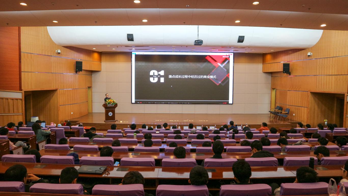第一阶段的嘉宾分享环节由张良玉拉开序幕。张良玉校友以《掌上大学Story&Style》为主题,从掌上大学起源、起伏、现在三个时间维度进行分享介绍,他以一路走来的点滴创业故事勉励同学坚守初心是信仰,追求本质是能力,全力以赴是态度。随后,兰一辉校友以《商业模式与短视频》为主题进行了生动的演讲。兰一辉以捷点成长过程中经历过的商业模式为切入点,就自己15年以来创业背景下对互联网+时代市场现状及行业前景进行了探讨,刷新了在场师生对商业模式与短视频的认识。