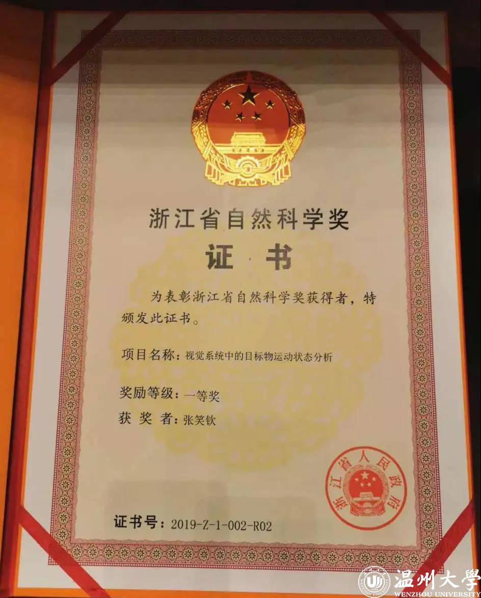日本色情 张笑钦院长所参与的《视觉系统中的目标物运动状态分析》获得浙江省科学技术奖自然奖一等奖。