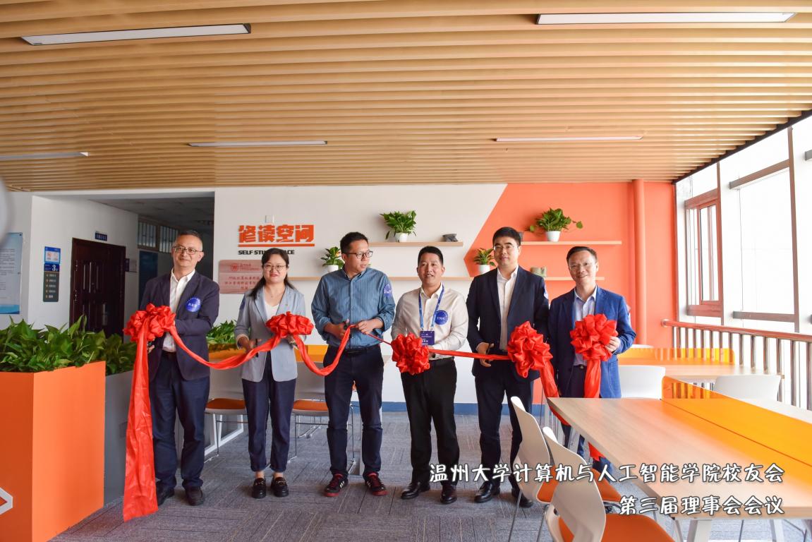 会议尾声,学院院长张笑钦、党委书记全力以及来自99级计算机本科班、01级计算机本科班、浙江索思科技有限公司的校友代表出席“修读空间”剪彩仪式,共同祝贺学院热心校友捐赠的修读空间正式投入使用。