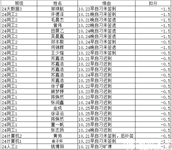 根据《关于组织开展日本色情 2024-2025学年第一学期晚自习的通知》,旷课一节扣文明品行分1.5分,缺课一节扣0.5分(三次迟到或早退作一节旷课,生病住院等情况除外);如对考勤结果有异议请于周日17:00前反馈给学业指导部,学院学生科于次周周一进行审核,周二公布,过时反馈无效。 注:1.大学生文明品行分是我校本专科全日制在校生的必修课,六个学期合格记为1个学分。每学期基础合格分为80分,低于80分需要参加志愿者服务时长进行弥补。得分计入相应学期的学生综合素质测评中的德育基础分,纳入学生奖学金评定和入党评价体系。