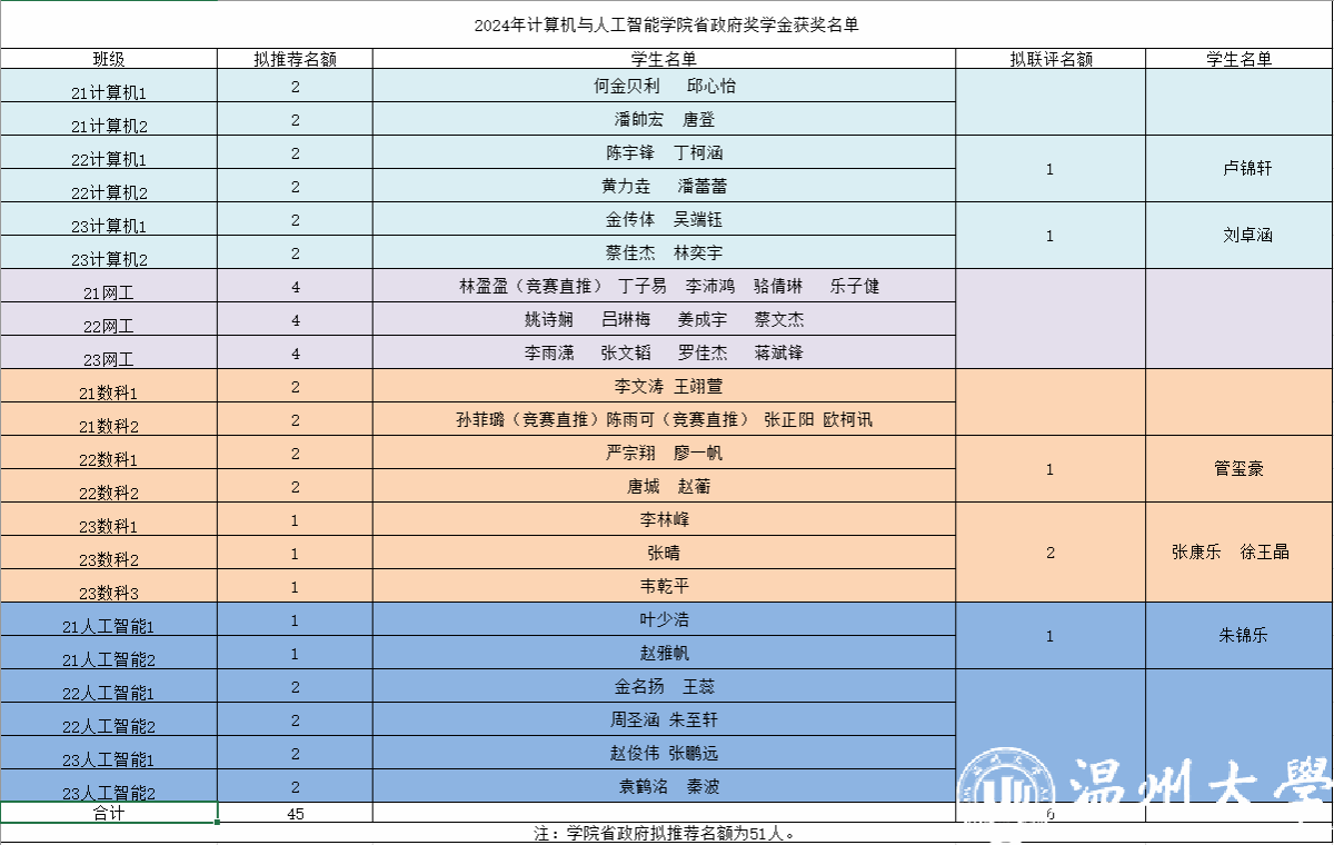 根据《关于浙江省2024年学生资助补助经费的通知》、《日本色情 学生资助管理办法》、学校《关于开展2024年国家奖助学金、省政府奖学金、学费减免等评审工作的通知》及学院《关于开展2024年省政府奖学金评定工作的通知》等文件要求,经过学院奖助学金评审小组审核、联评,拟推荐何金贝利等51位学生为2023-2024学年省政府奖学金获得者。现将名单予以公示,如有异议请在公示期内及时反馈。