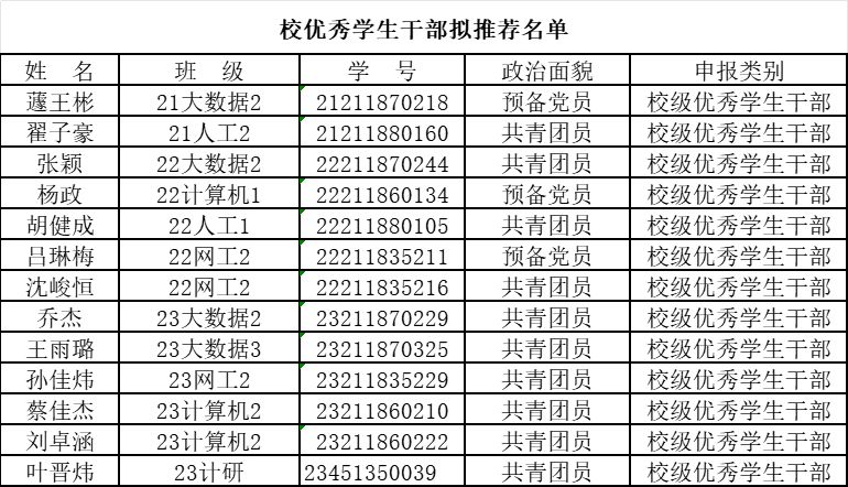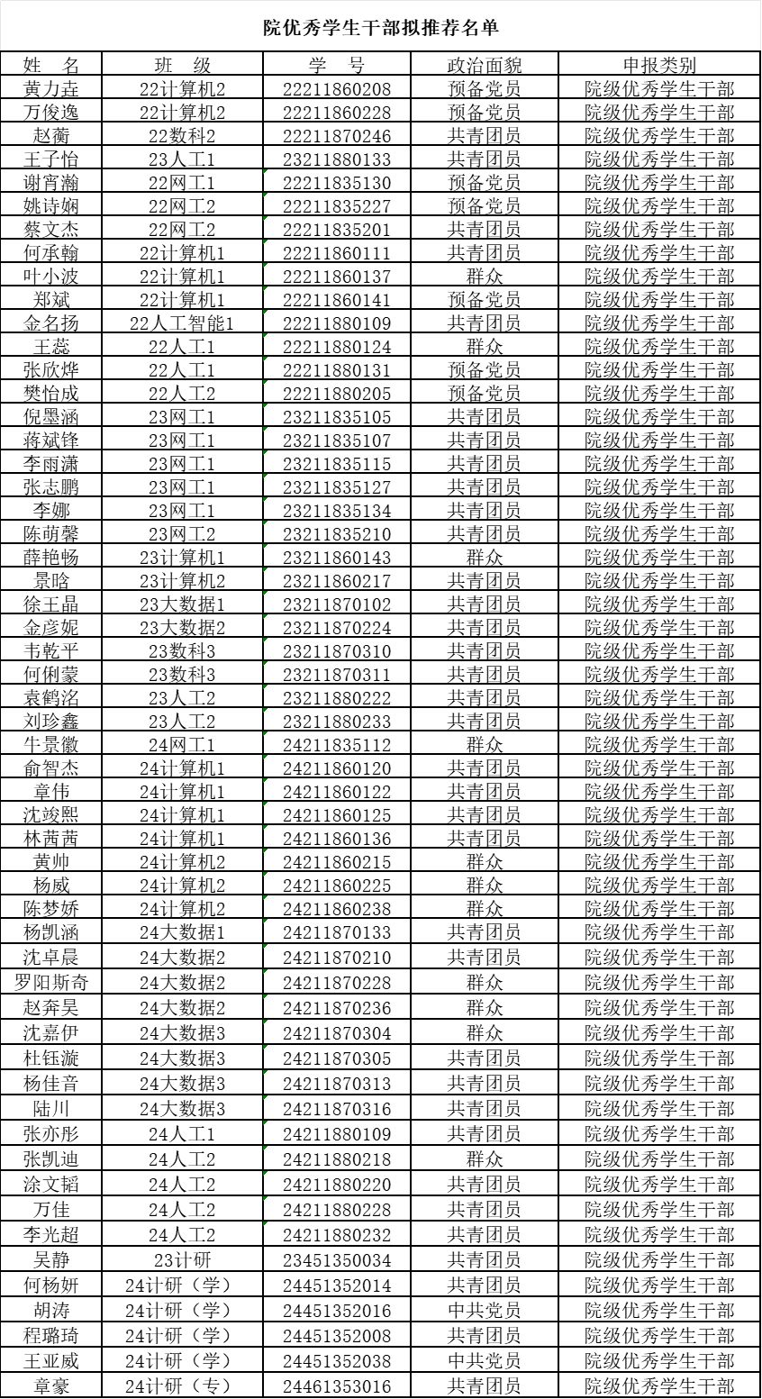 根据校团委《关于评选2024-2025学年第一学期优秀学生干部和工作积极分子的通知》,经学院各班级同学自主报名、班级推荐、院团委审核,拟推选以下同学为2024-2025学年第一学期优秀学生干部,现将名单予以公示。(注:排名不分先后)