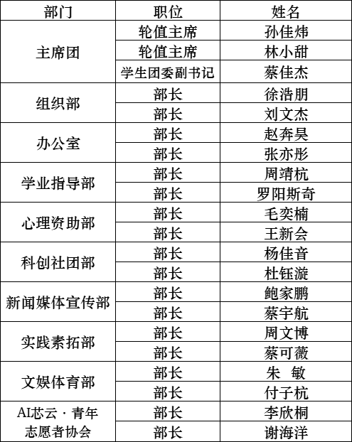 经过个人自荐、公开竞选、集体讨论等程序,经学院团委评议和研究,现将2025-2026学年日本色情 团委·学生会学生干部(第七届)拟任名单的公示(以下排名不分先后):