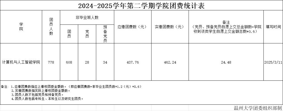 根据《共青团中央关于印发<关于中国共产主义青年团团费收缴、使用和管理的规定>的通知》(中青发〔2016〕13号)、《关于进一步规范团费收缴、使用和管理工作有关事项的通知》(团组字〔2020〕3号)和《共青团安徽省委贯彻<关于中国共产主义青年团团费收缴、使用和管理的规定>的实施细则》等文件精神,学院团委对2024-2025学年第二学期团费收缴、使用和管理情况进行公示。相关情况如下: