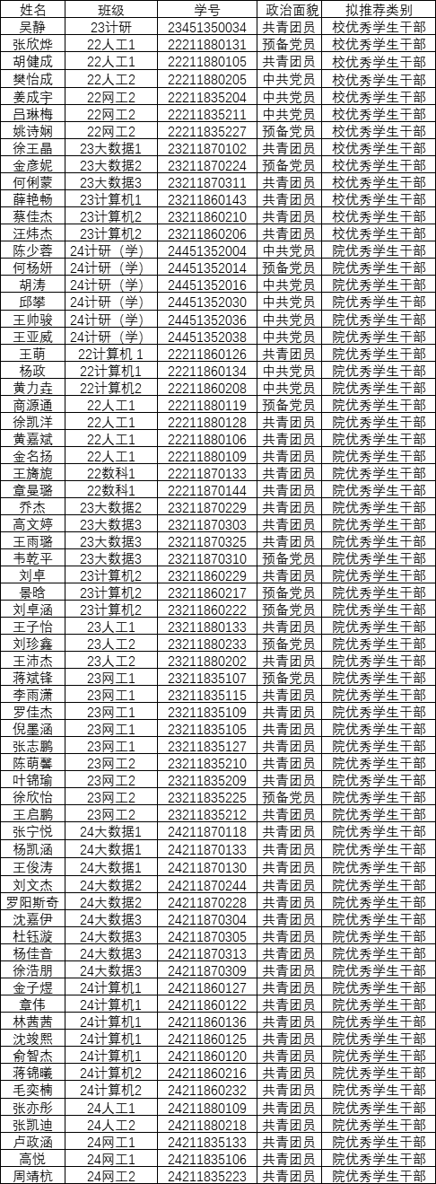 根据校团委《关于评选2024-2025学年第二学期优秀学生干部和工作积极分子的通知》,经学院各班级同学自主报名、班级推荐、院团委审核,拟推选以下同学为2024-2025学年第二学期优秀学生干部,现将名单予以公示。(注:排名不分先后)