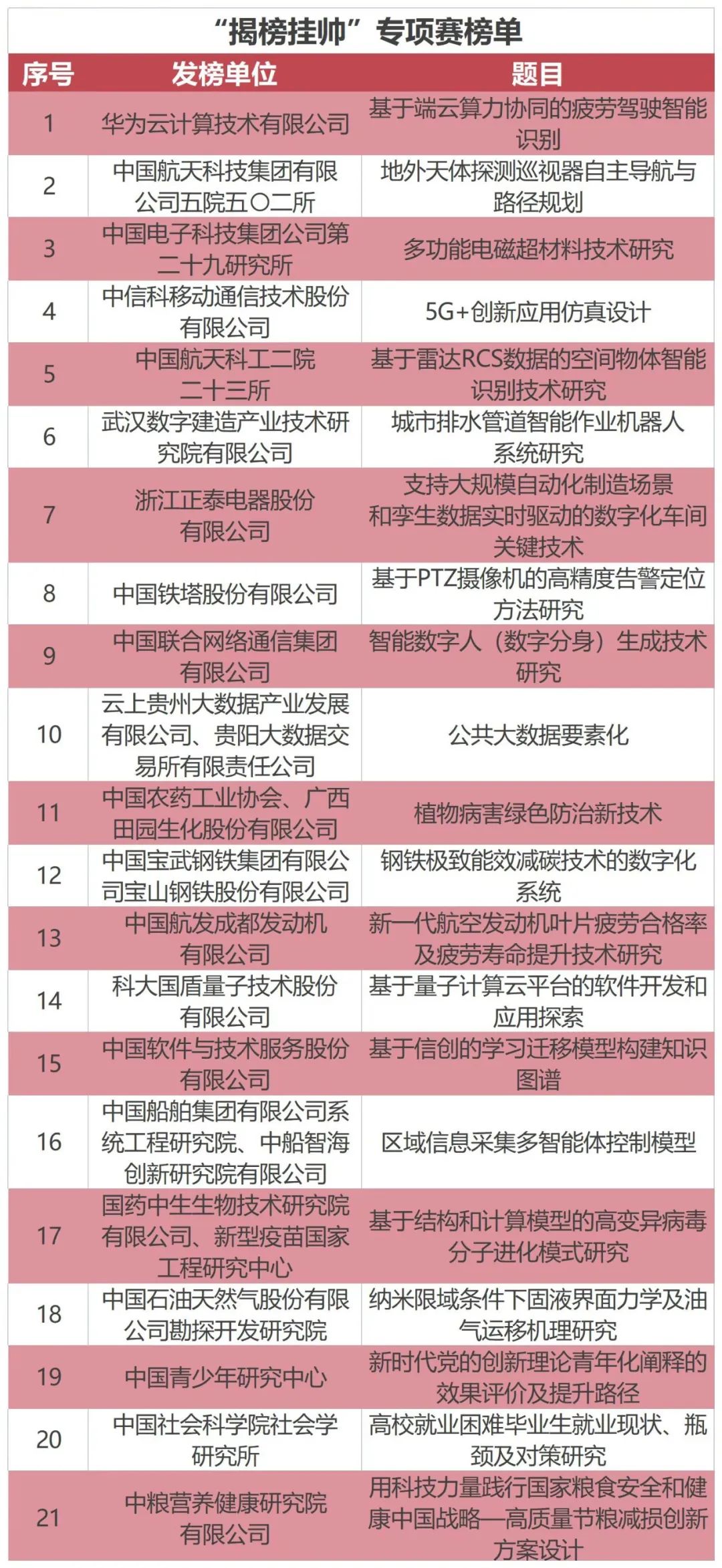 以“政企发榜、竞争揭榜、开榜签约”的方式,通过“征榜—发榜—竞榜—评榜—夺榜”,最后针对每个选题评出1名“擂主”。比赛一经推出,得到了社会各界的广泛关注。2022年12月—2023年1月,组委会面向中央部委、地方政府、行业协会、科研机构、企事业单位等广泛征集选题。经资格审查、专家评审,最后遴选出21个前沿性、应用性和可赛性较强的选题,具体榜单如下,各选题比赛详细方案见附件。
