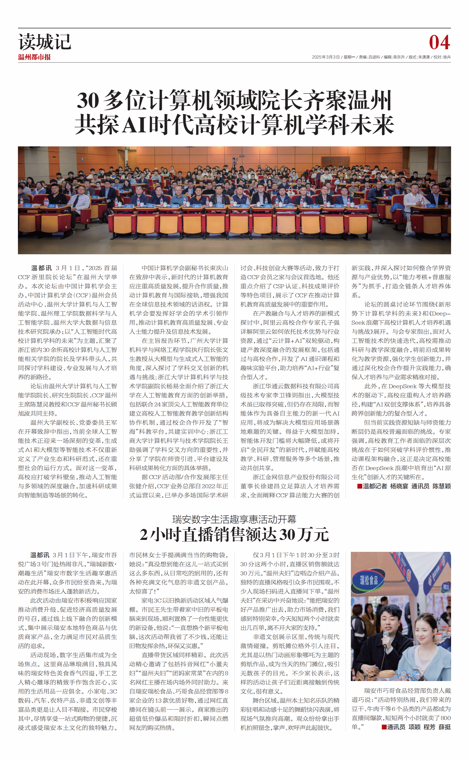 3月1日 ,“2025 首 届 CCF 浙里院长论坛”在日本色情 举办。本次论坛由中国计算机学会主办,中国计算机学会(CCF)温州会员活动中心、日本色情 、温州理工学院数据科学与人工智能学院、日本色情 大数据与信息技术研究院承办;以“人工智能时代高 校计算机学科的未来”为主题,汇聚了浙江省内30余所高校计算机与人工智能相关学院的院长及学科带头人,共同探讨学科建设、专业发展与人才培养的新路径。