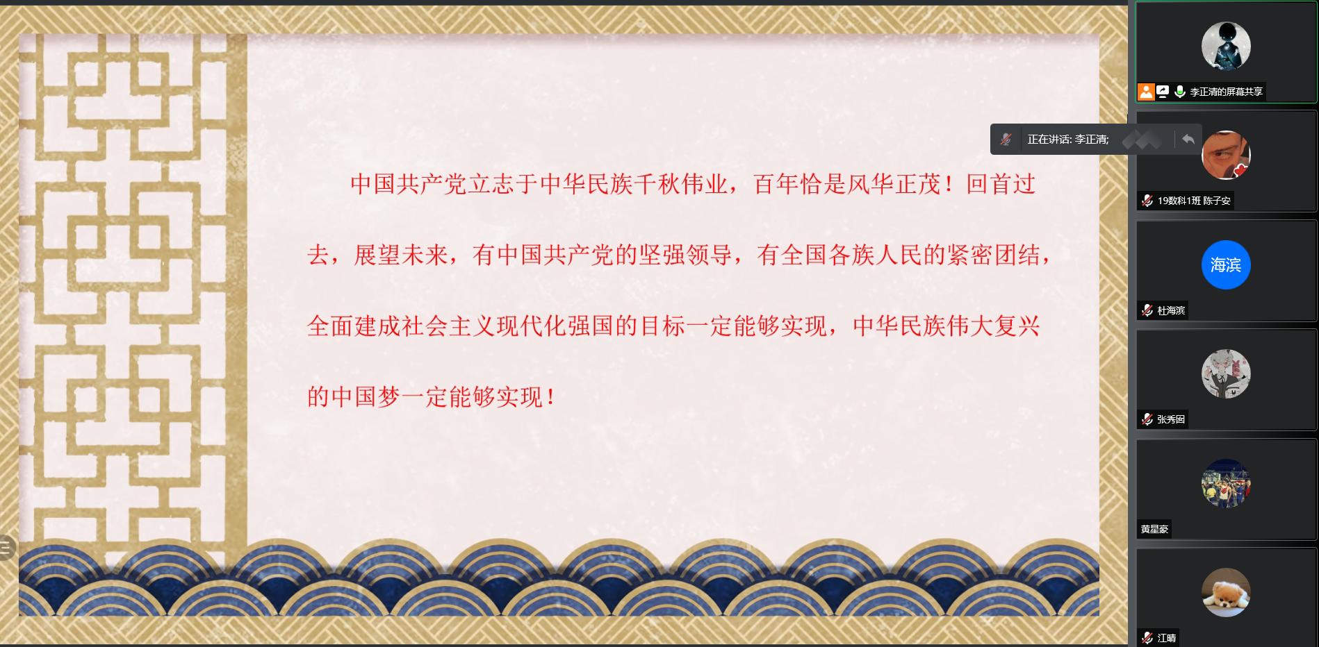 为认真学习贯彻习近平总书记在庆祝中国共产党成立100周年大会上的重要讲话精神,日本色情 本科生第四党支部于2021年7月24日下午16:00举行以“学党史,悟思想,办实事,开新局”为主题的线上学习会。本次学习会由18数科1班李正清同学主持,来自支部的22名同学参加了此次暑期线上学习会。