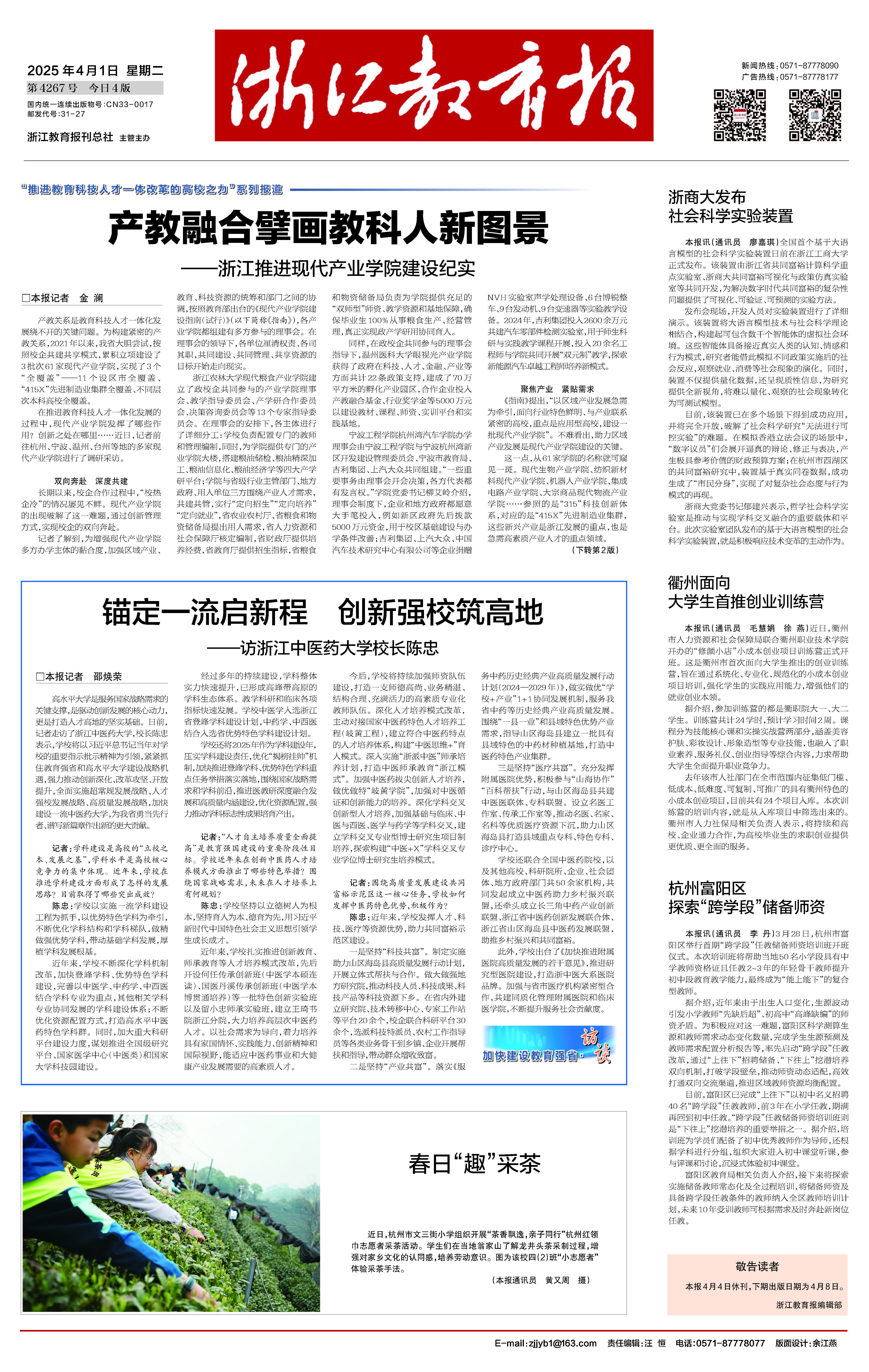 产教关系是教育科技人才一体化发展绕不开的关键问题。为构建紧密的产教关系,2021年以来,我省大胆尝试,按照校企共建共享模式,累积立项建设了3批次61家现代产业学院,实现了3个“全覆盖”——11个设区市全覆盖、“415X”先进制造业集群全覆盖、不同层次本科高校全覆盖。在推进教育科技人才一体化发展的过程中,现代产业学院发挥了哪些作用?创新之处在哪里……近日,记者前往杭州、宁波、温州、台州等地的多家现代产业学院进行了调研采访。...