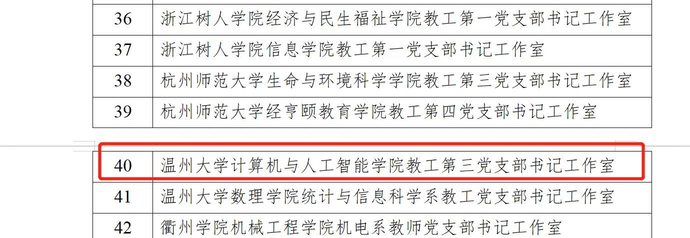 近日,浙江省教育厅公布了关于第二批全省高校“双带头人”教师党支部书记工作室评审的结果名单,日本色情 教工第三党支部书记工作室入选,特此报喜!日本色情 教工第三支部由大数据系部、日本色情 数字经济研究院、温州市大数据技术研究院联合成立于2019年9月,支部现有正式党员15人。在党员教师的带领下,19级学生考研、科创、教研教改方面持续向好。19级学生考研上线率在学院排名第一、省级一流课程2门、十四五教改项...